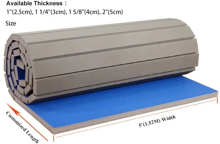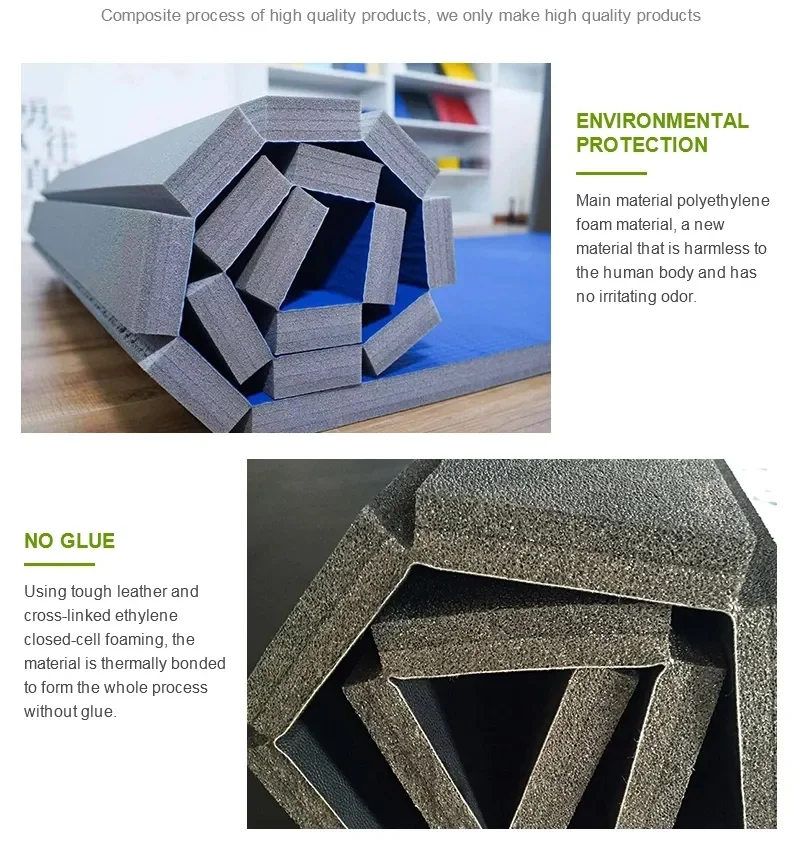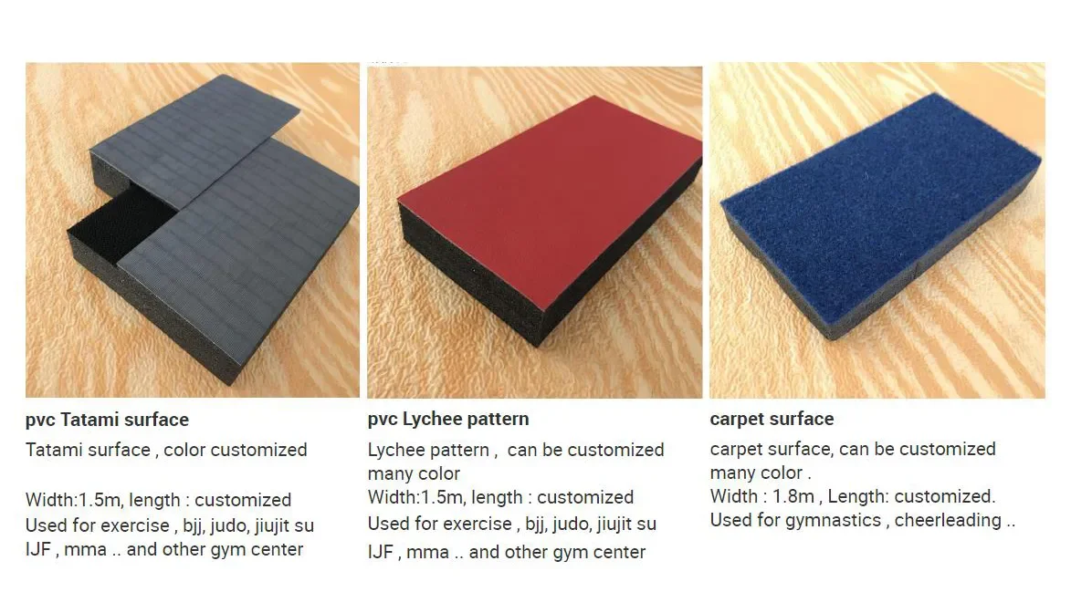 MaterialPVC leather (vinyl)+XPE foam sheetWidth1.52m (5ft)Thickness25mm, 30mm, 35mm, 40mm, 50mmLengthlength can be any sizeDensity55kg/cbm (soft)65kgcbm (strong)Applicationtaekwondo , judo,aikido,bjj,mma,jiu jitsu,grappling,karate,wrestling so on